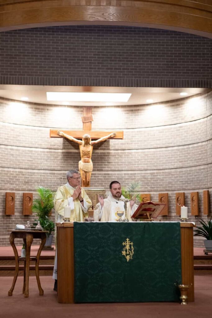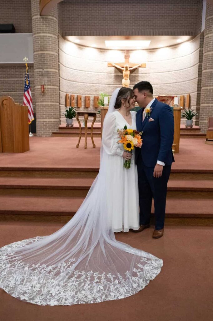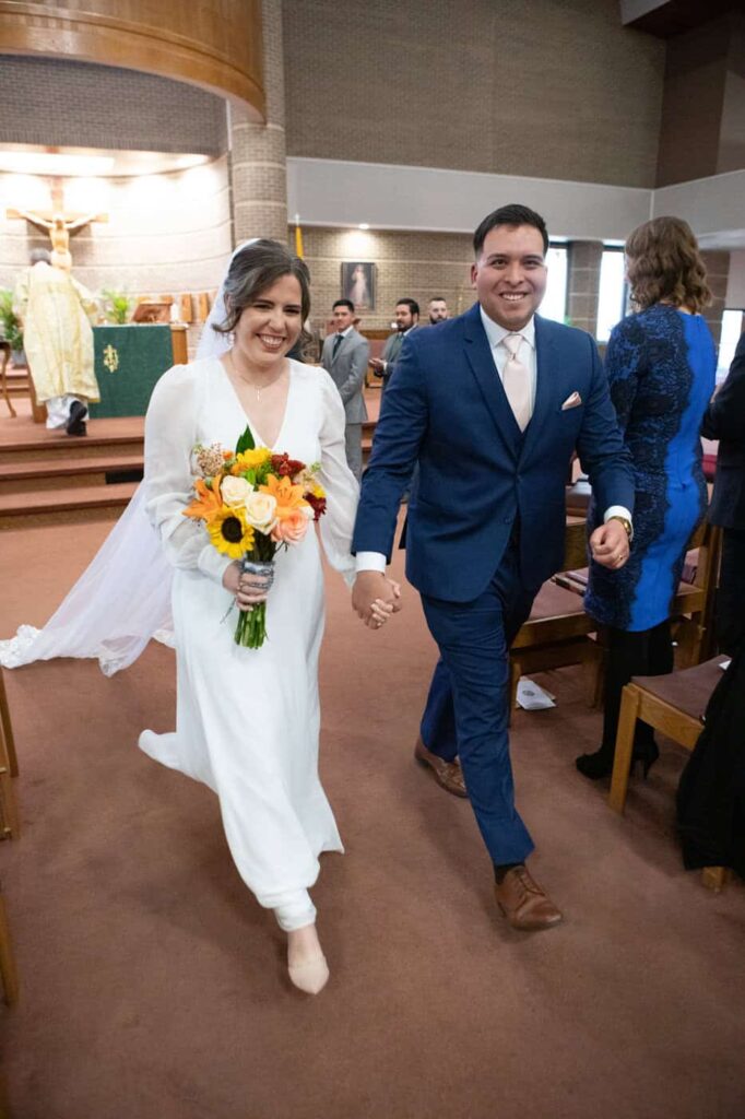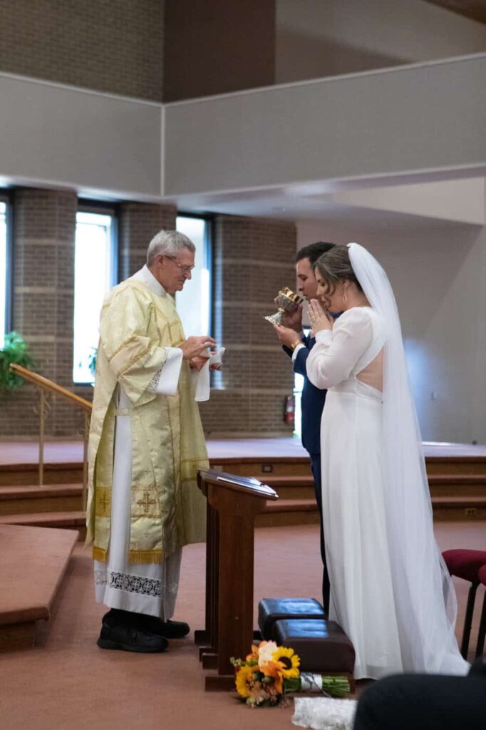 The mass included readings by close friends and family, receiving the eucharist together, a moving homily, classic vows, and a marital blessing.