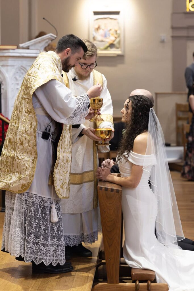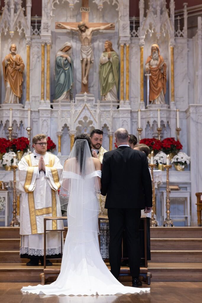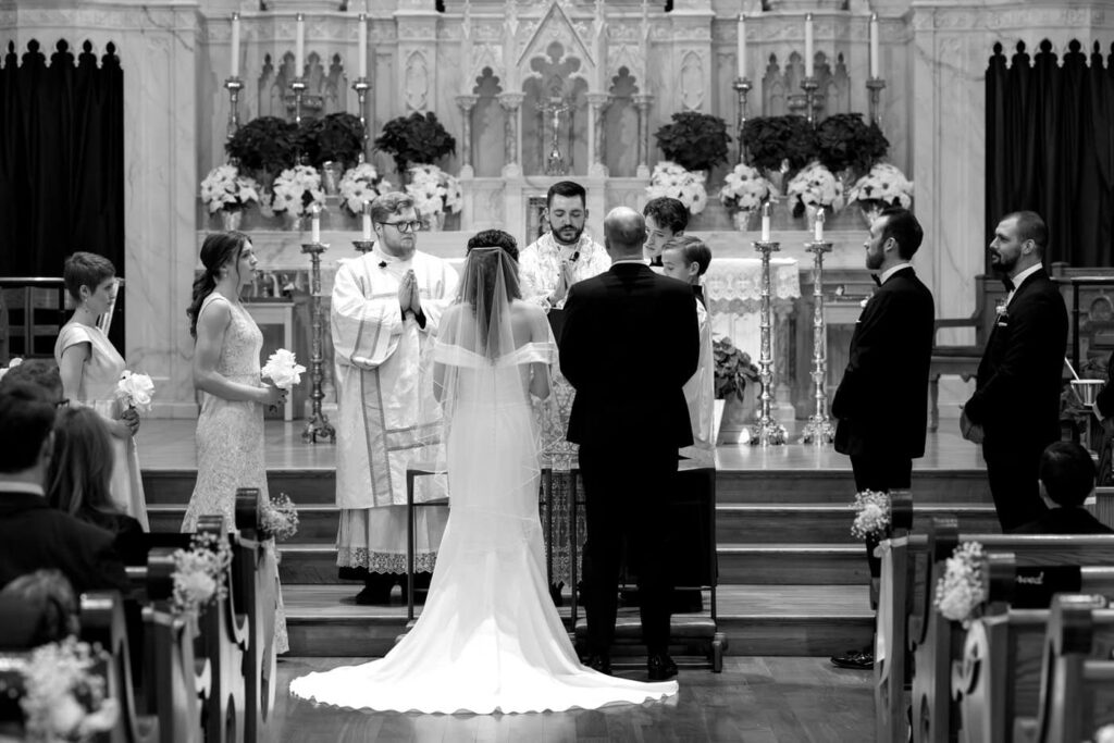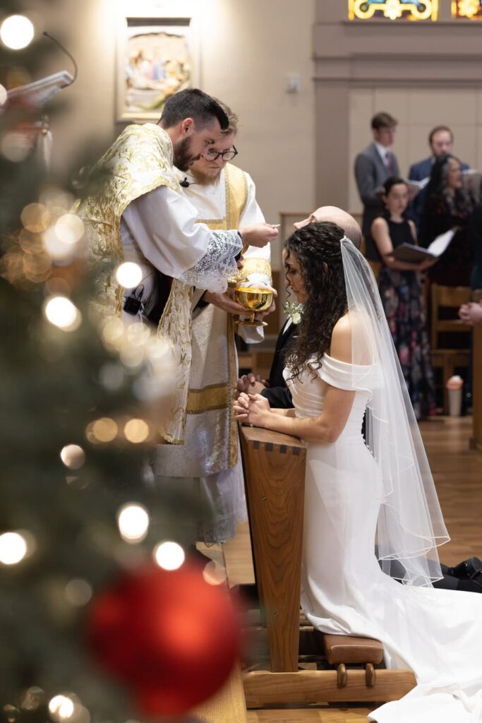 They had family and friends serving in every capacity at the mass! Dan’s cousin was the priest and their friend from high school was the deacon who gave the homily. Dan’s cousins and friends were also the altar servers and acolytes. Eva’s family friends brought up the gifts, family friends played the violin and viola, and friends and cousins sung in the choir. Then, Dan’s brother and sister and Eva’s good friend did readings and the prayers of the faithful. It was so moving to see how their whole community came together to participate in the mass and support the couple as they were married.