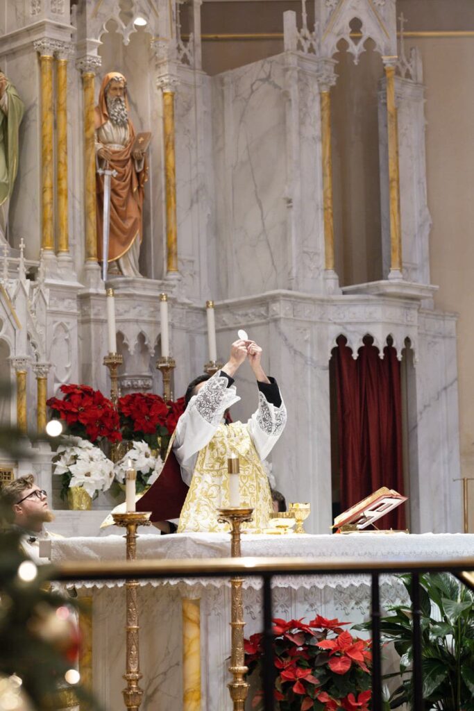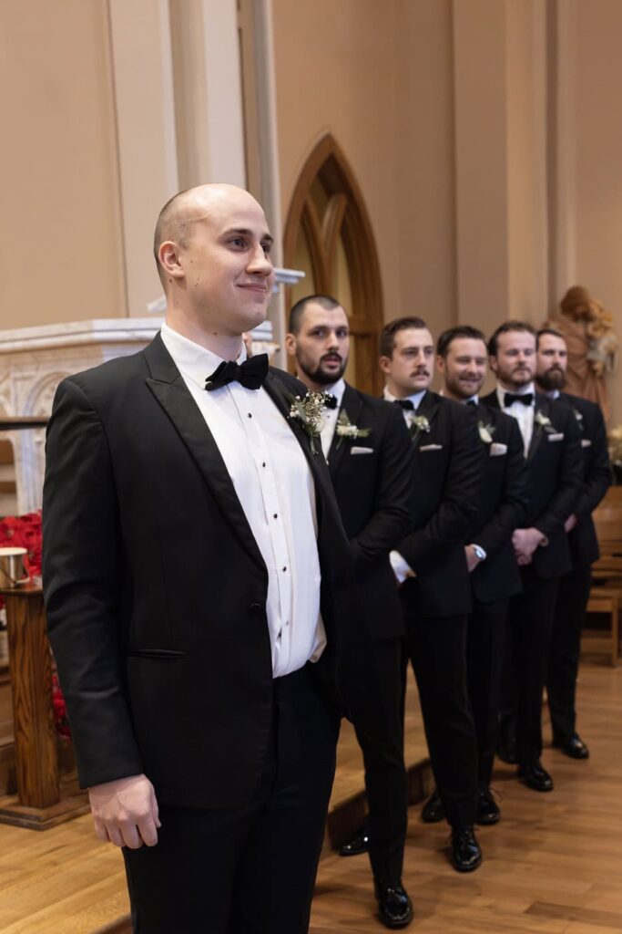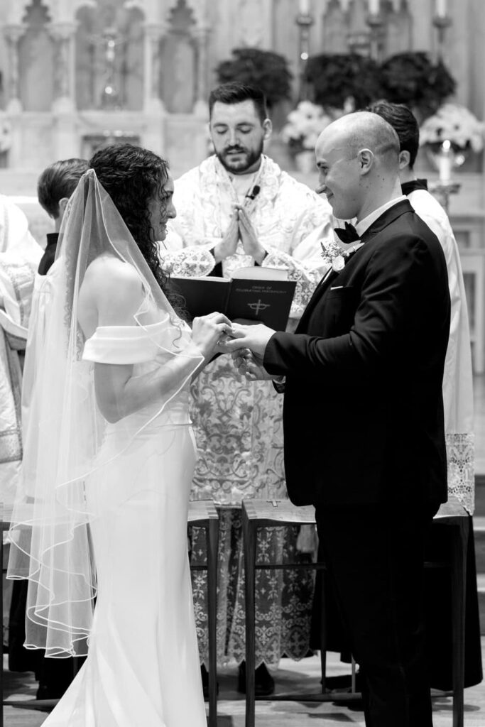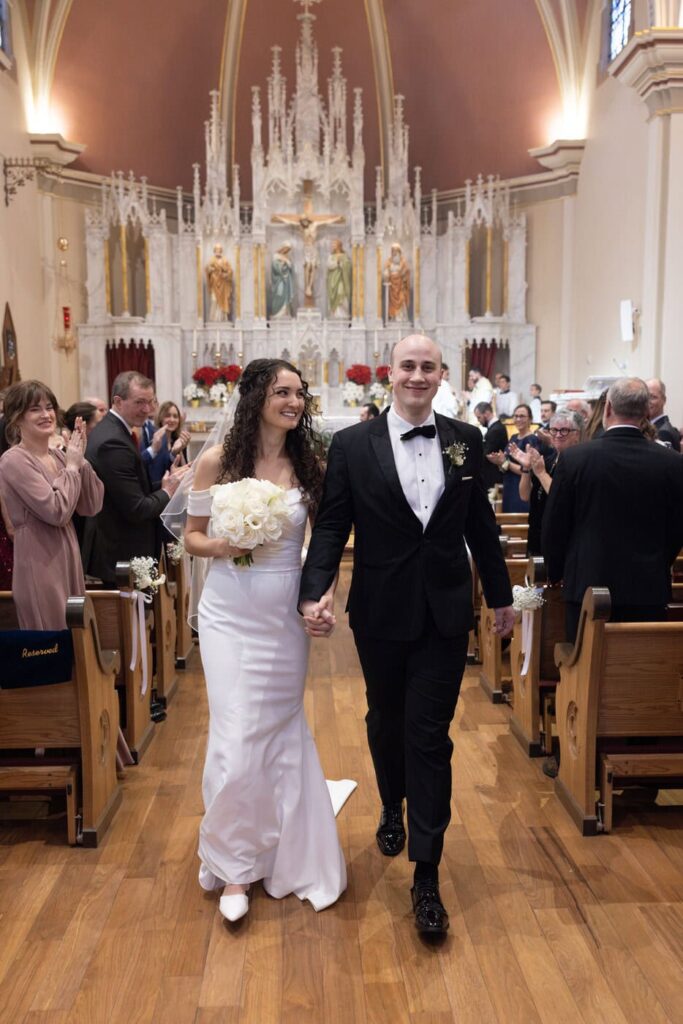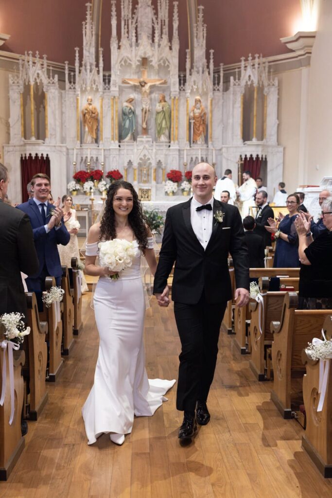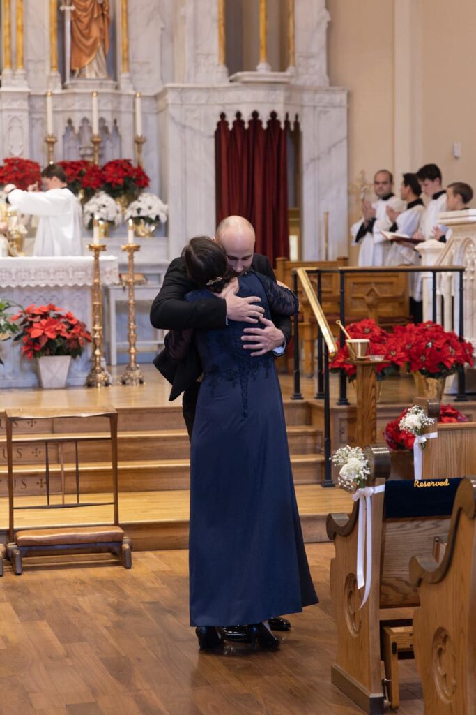 The mass began with a traditional processional of those serving in the mass, Dan and his mother, and then the full bridal party including Dan’s little brother as the ring bearer. Eva was beaming as she walked down the aisle with her father and Dan started tearing up and continued to throughout the whole mass.