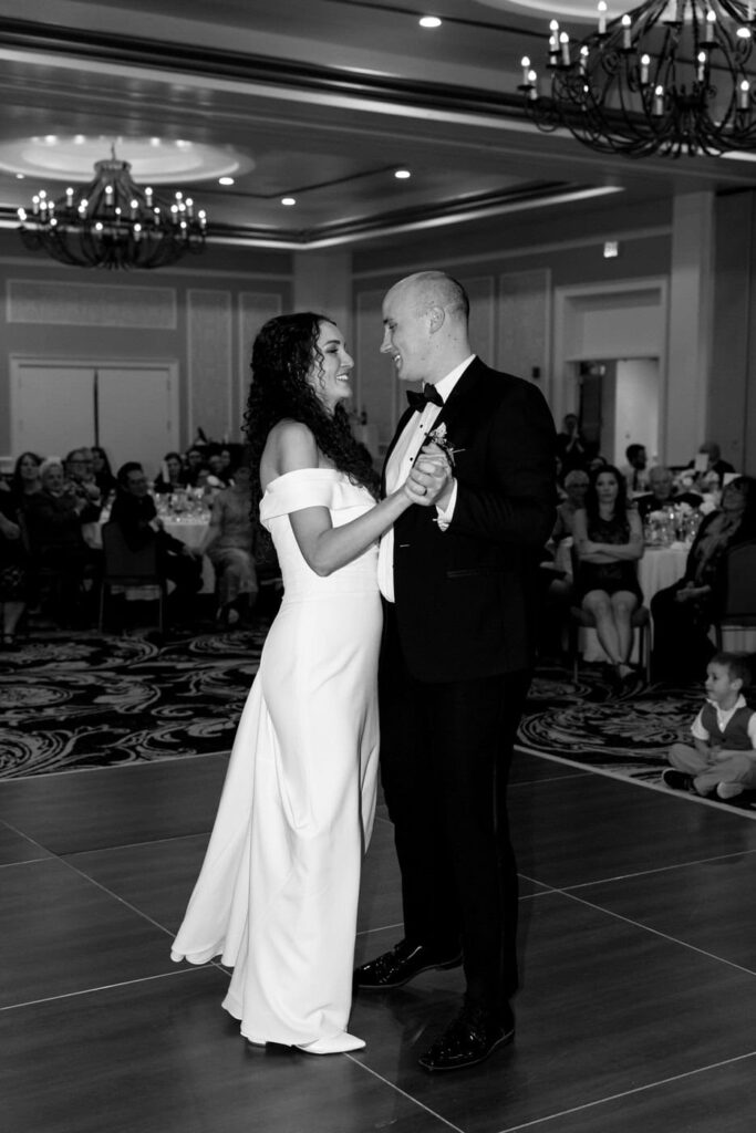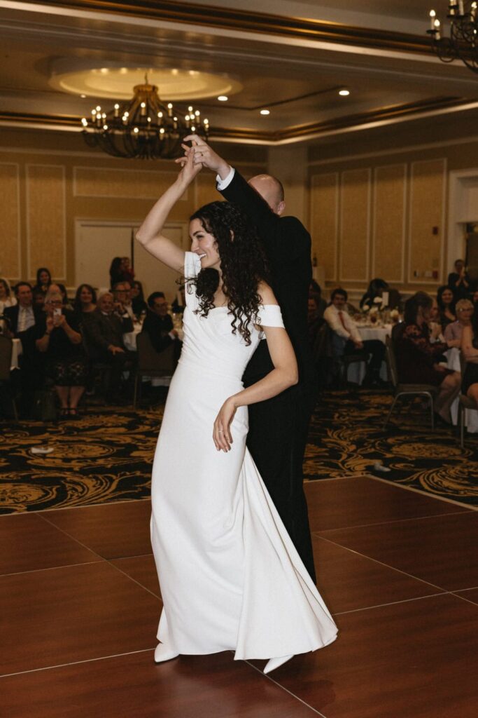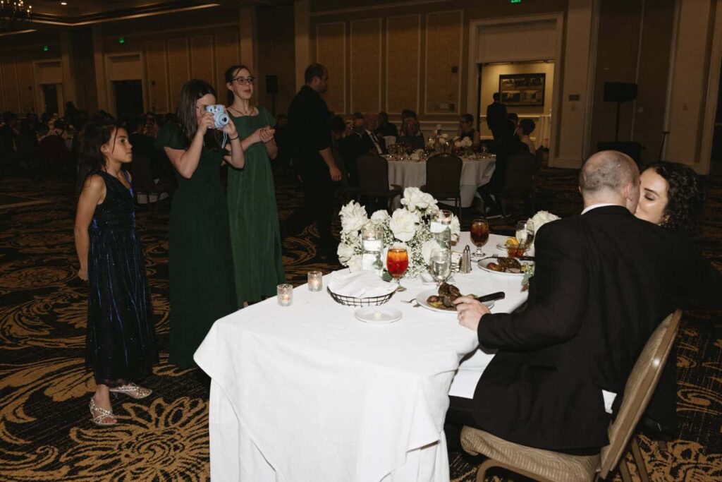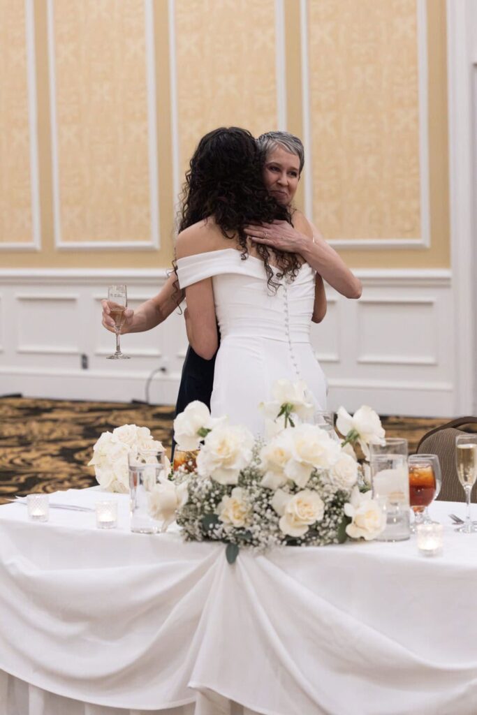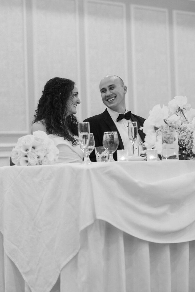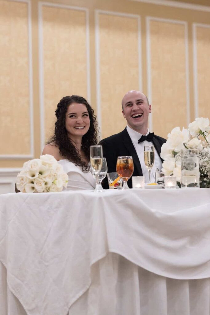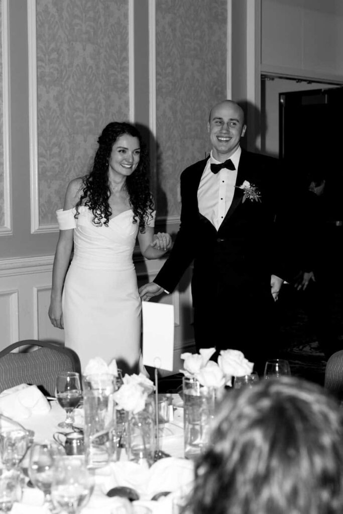 Soon after the guests entered the ballroom, the bridal party and the bride and groom made their grand entrance. A plated steak dinner was served and guests had a great time chatting over the meal. Dan and Eva finished their meal and took a turn around the room to greet their guests.