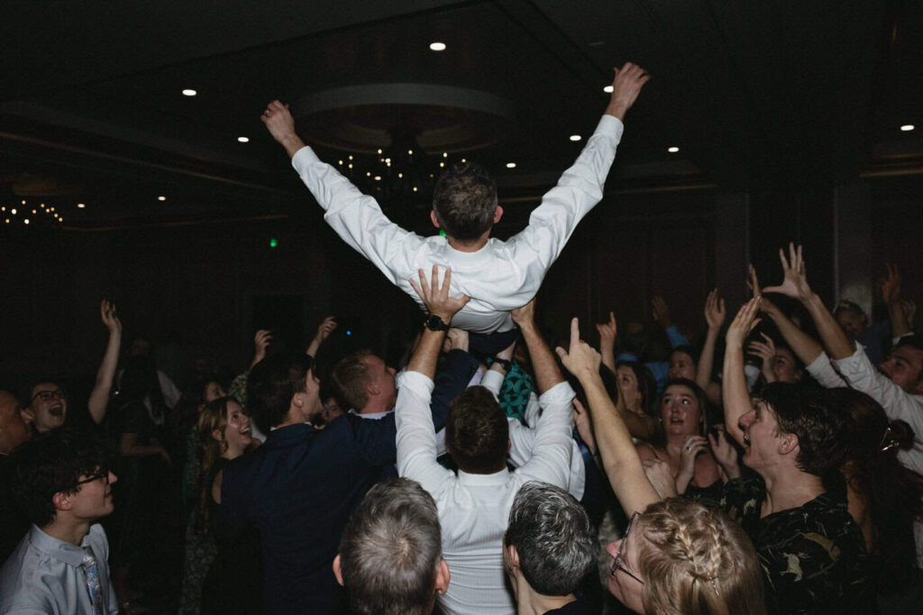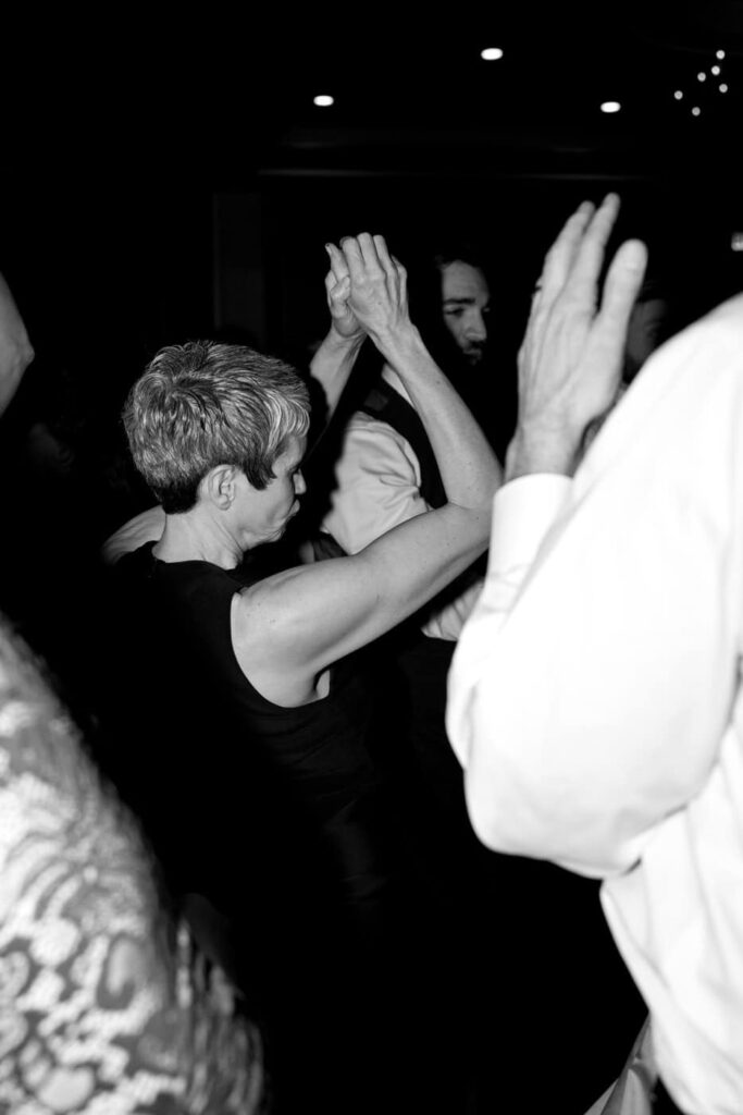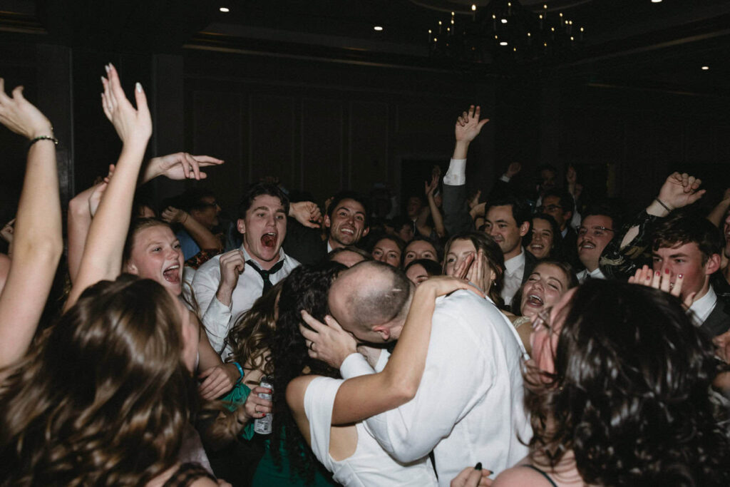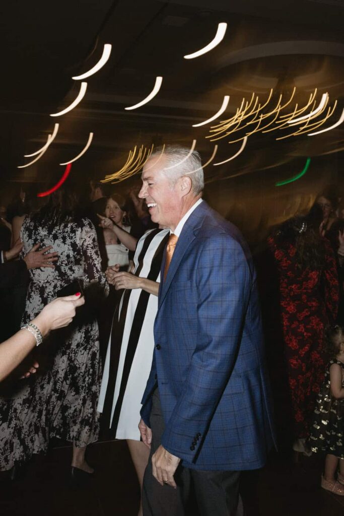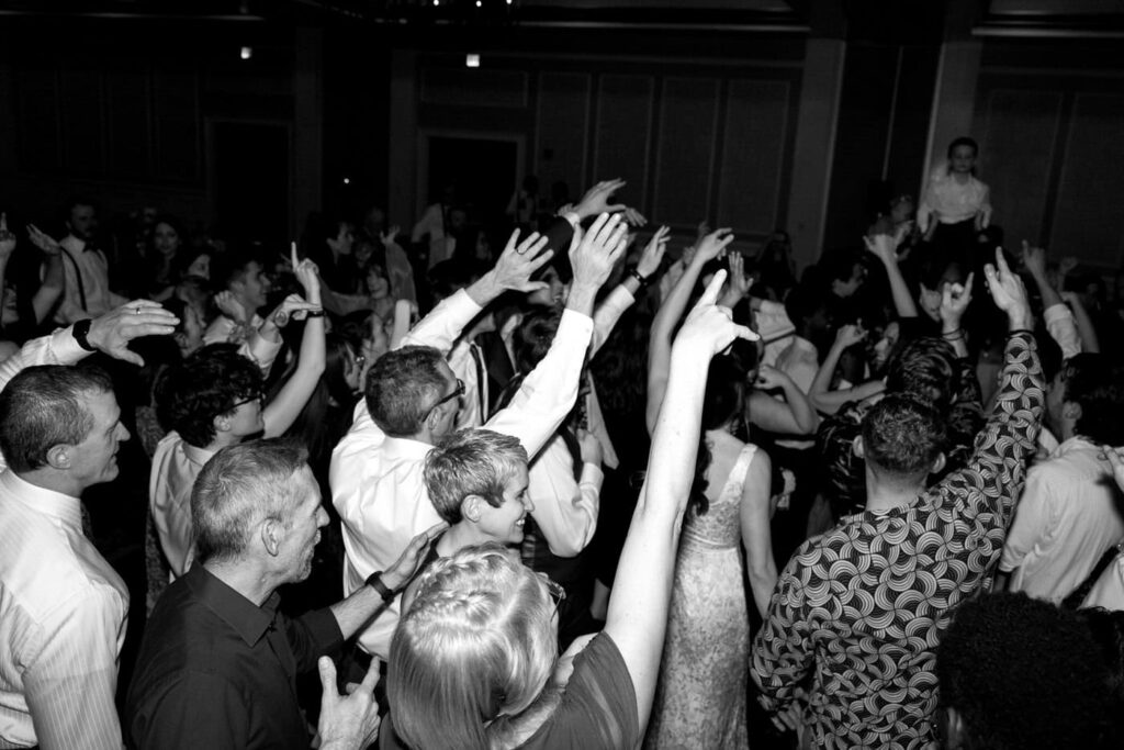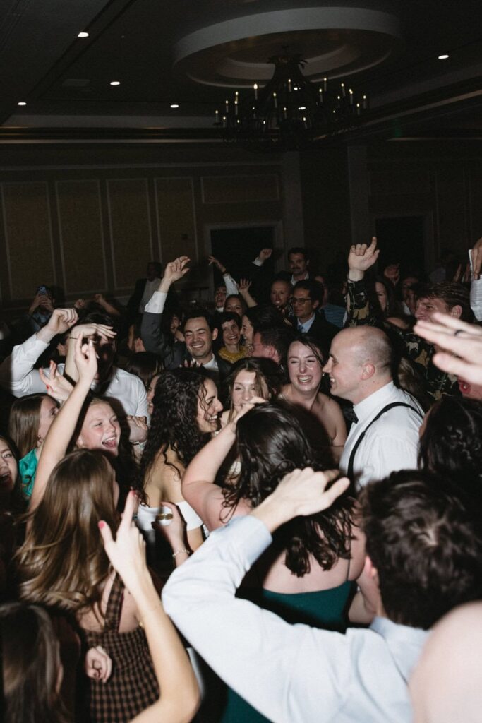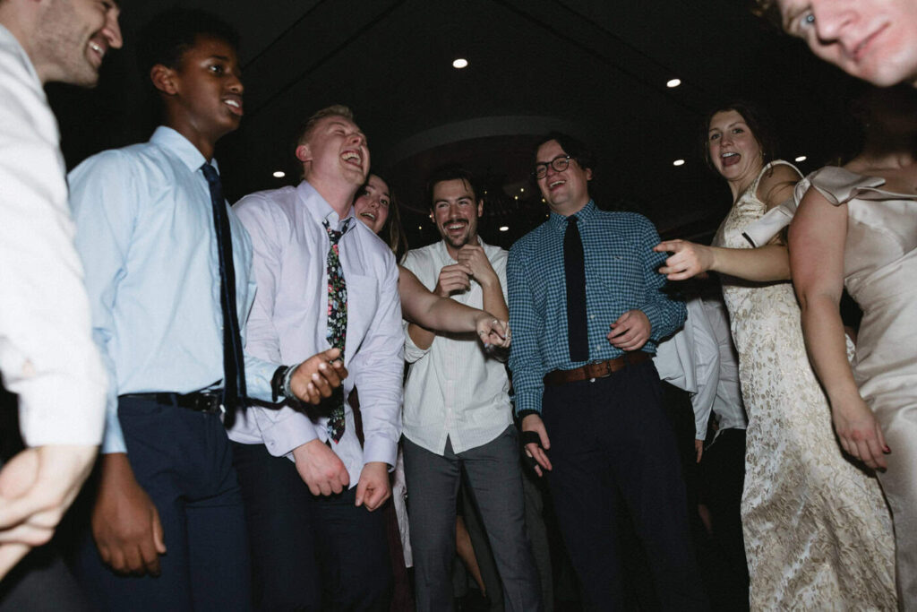 Dan and Eva cut the cake– a gluten-free, dairy-free beauty from Sweet Elizabeth’s Organics. They kicked off the dance floor with their first dance, Eva danced with her dad who was smiling the whole time. Then DJ Casey really got party started and the dance floor remained full the entire rest of the evening! Talk about a great party. The father of the bride was surprised to be lifted up into the air and crowd surf for the first and probably only time in his life. At a wedding reception, I love to get in on the action– make my way to the dance floor and get close ups of the guests having the best time. So of course I have to share some of those dance floor photos here!