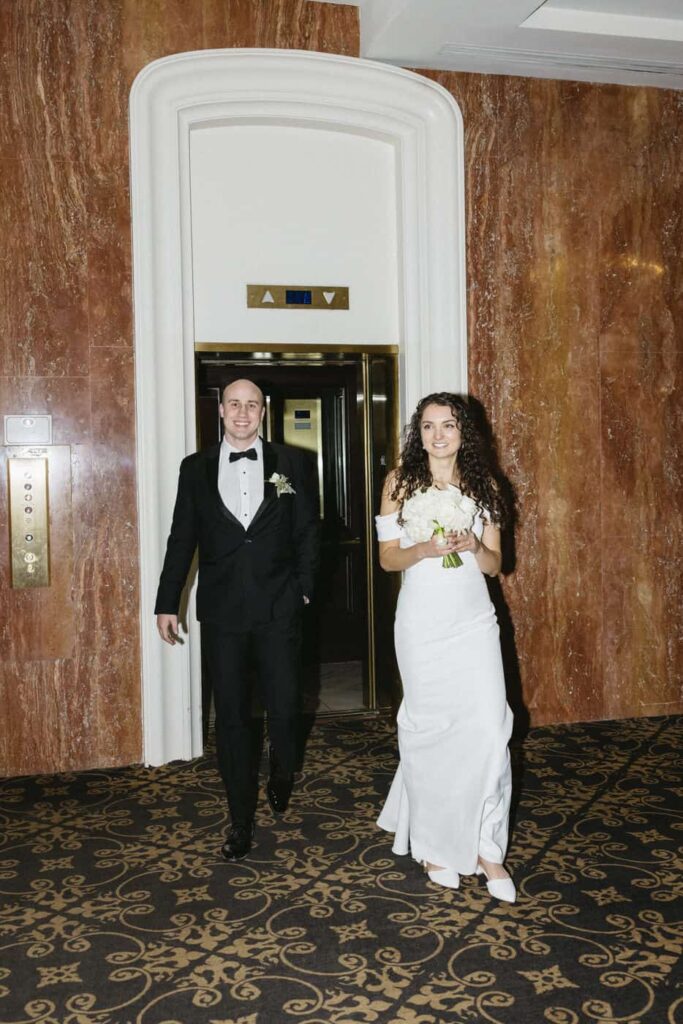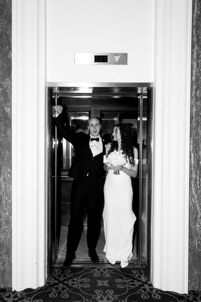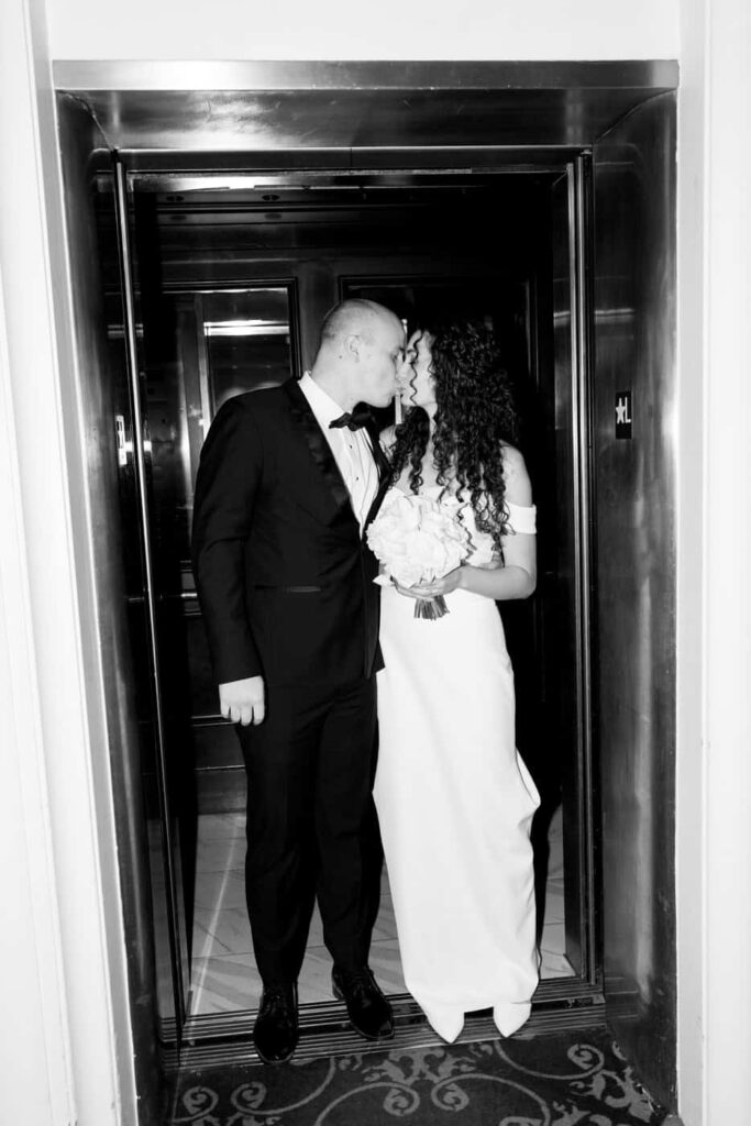 While guests were mingling, we took a quick moment to snap a few flash photos of Dan and Eva near the hotel elevator.