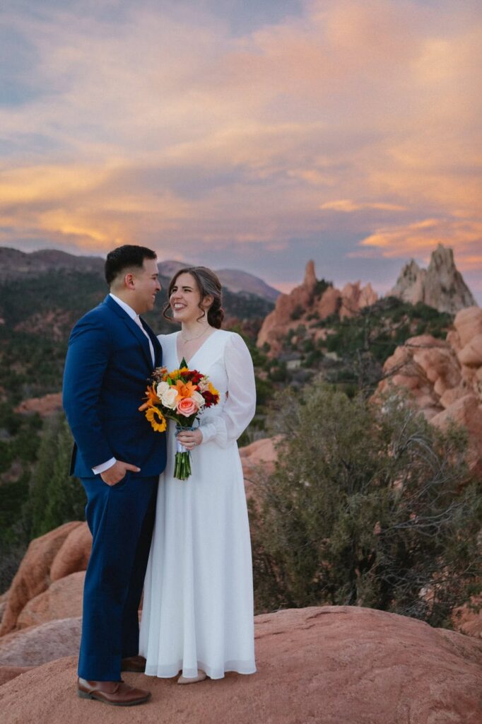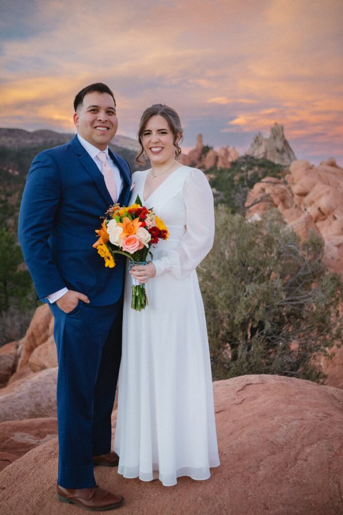 Sarah and Rex had a Catholic church ceremony and wanted to take their portraits at the Garden of the Gods before the reception at Wedgewood at Black Forest. Their bridal party and siblings and me, their fun-loving photographer, hopped into a party bus after the ceremony and headed to the Garden. When we got to the main entrance, it was closed! So we had to pivot and direct the bus driver to the back entrance, which ended up being fortuitous because it led us up to the highest point in the park. As we started taking photos, the colors in the sky began popping and by sunset they were bringing all the colorful drama. It was the perfect night for outdoor portraits.
