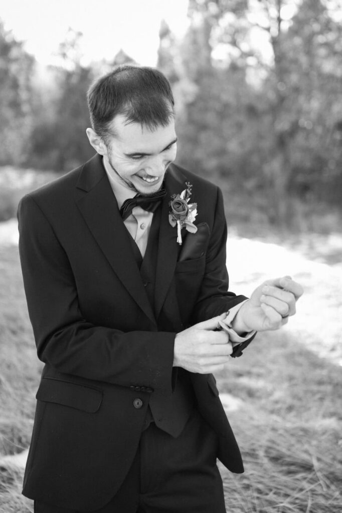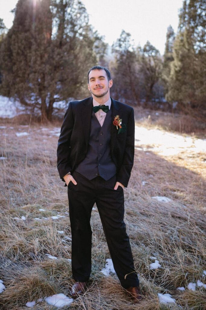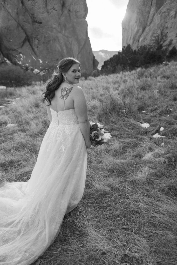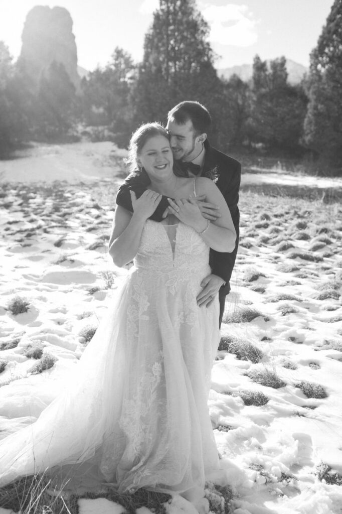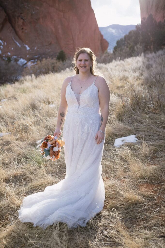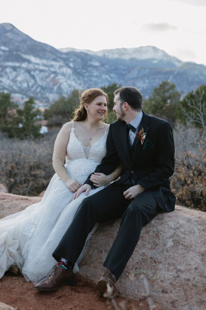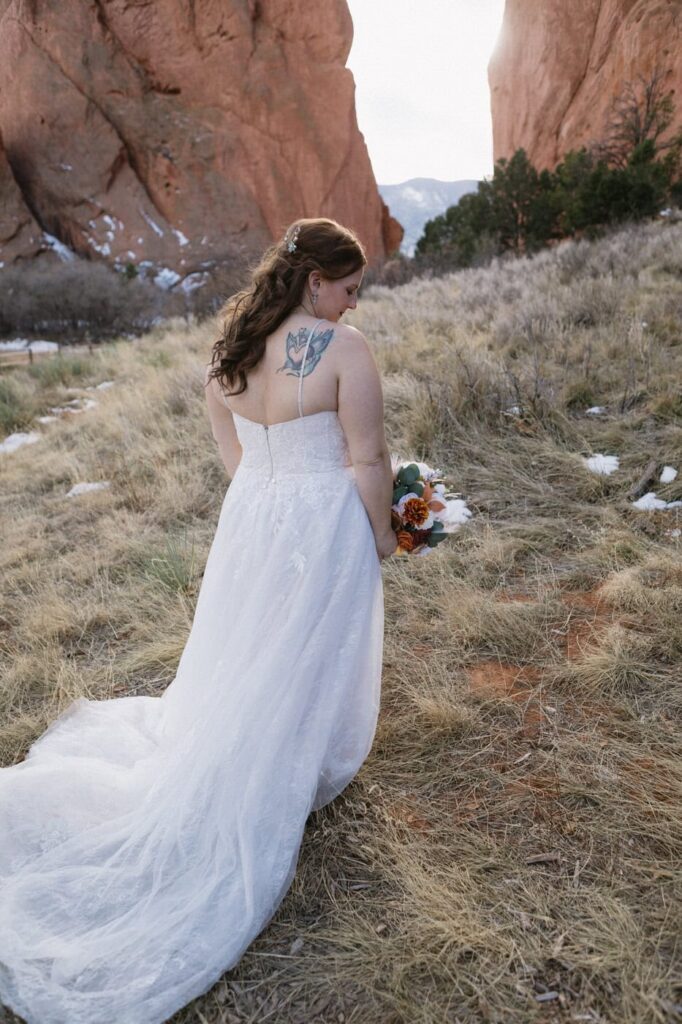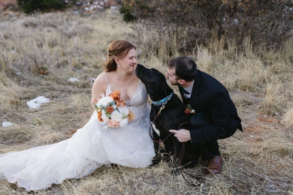 The next set of bride and groom portraits are also from late in the year, this time December. Valerie and Nick reached out to me because they wanted more pictures in their wedding attire. They had been married the previous summer but didn’t get enough portraits of the two of them on their wedding day. I was happy to oblige and suggested the Garden of the Gods as the location for the photos. They brought along their sweet pup and we went to two locations in the park– the central garden and the high point overlook. Starting in the central garden, we got some beautiful individual photos of each of them and some of them together. Pup featured in a few of course too.